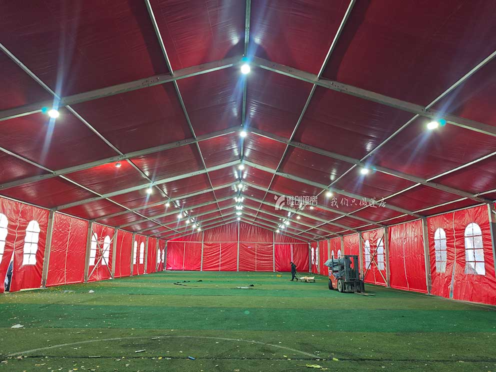 在篷房内部,厂家精心布置了浪漫的灯光和装饰,让整个空间充满了梦幻般的氛围。红色纱幔轻轻垂挂,与红色的篷布相得益彰,增添了更多的喜庆元素。同时,篷房内还配备了温暖的加热设备,确保新人和宾客在寒冷的天气中也能感受到温暖如春的环境。